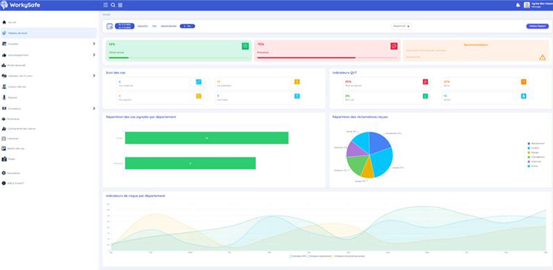 WorkySafe est une solution SaaS ou en premise dédiée à la gestion de la Qualité de Vie au Travail (QVT) et des Risques Psychosociaux (RPS). Grâce à des questionnaires RPS et des algorithmes intelligents, nous vous aidons à analyser et prévenir les risques, tout en créant des plans d’action ciblés.